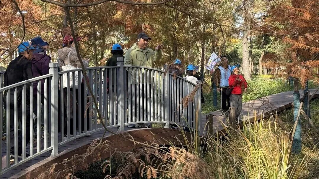 居民们漫步的这条南北蜿蜒、全长3.64公里的步道,正是上海首条林下绿道。它如一条绿色丝带,将“野生动物科普”“滨江芦苇栖息”“林湿复合生态”三大区块有机串联。大家行经由树桩、树皮等可再生材料打造的童趣小品,在观鸟平台远眺越冬的候鸟,于笔直挺拔的水杉林间,感受四季流转赋予树木的静穆与庄严。来自浦秀苑的张阿姨感叹:“以前觉得生态建设是个很大、很远的词,今天走在这里,听着故事,看着风景,才真切感受到它如何一点一滴改变了我们的生活品质。”