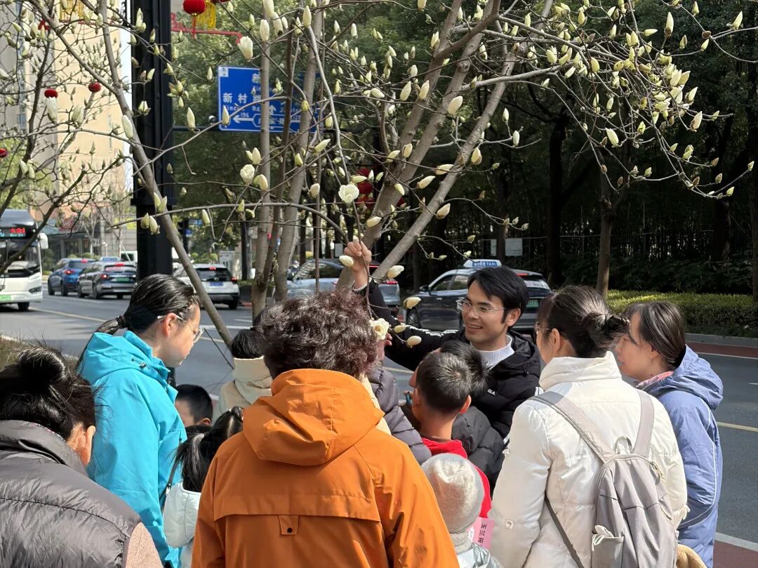 活动中,老师为亲子家庭带来了超有趣的玉兰科普小课堂,他用生动易懂的语言,结合辖区常见的玉兰品种,给大家系统科普春日常见的玉兰品类,重点讲解了洁白素雅的白玉兰、艳丽修长的紫玉兰、粉紫渐变的二乔玉兰,还特意补充了广玉兰(又名荷花玉兰)的辨识小技巧——从叶片质地到花朵形态,一个个形象的比喻,把枯燥的植物知识变得鲜活有趣,孩子们听得眼睛发亮,时不时举手提问,真切感受到“春日信使”带来的生机与美好,也加深了对街区春日景观的热爱。