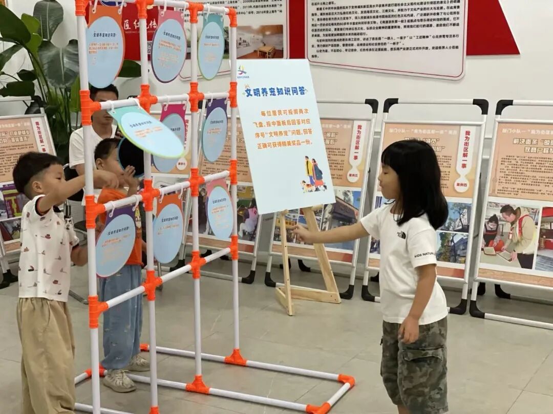 在文明养宠宣传中,通过分发《文明养宠指南》宣传页与开展“文明养宠飞盘游戏”两种形式,持续引导居民树立责任意识。宣传页系统普及科学养宠知识,飞盘游戏则将行为规范融入趣味互动,推动文明养宠理念在寓教于乐中深入人心,共同营造人宠和谐的社区环境。