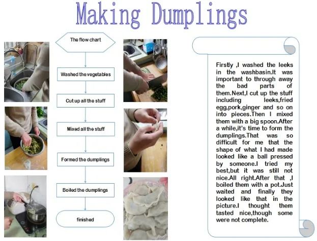 同一天,该校八年级同学的英语作业是做一份美味佳肴与家人共享,并绘制流程图,以流程图为写作框架完成英语短文写作。布置这份特殊作业的俞珈玫老师表示,居家学习期间恰是对学生进行劳动教育,使学生树立正确劳动观念的良机。该作业将英语八年级下第二单元《Water Talk》单元教学目标中的写作目标与八年级的劳动教育课程(学做美味佳肴)相融合,旨在让学生运用课堂所学,在实践创新中体验劳动的意义和快乐,并在流程图的制作与短文写作中总结心得体会,培育学生积极向上、活泼乐观的精神。