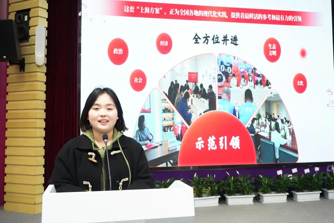 张钰、郭丙辰两位讲师联袂呈现《“开路先锋、示范引领、突破攻坚”——上海在中国式现代化新征程中的角色与担当》,从历史纵深与时代要求出发,以青年学子的独特视角层层深入:从“开路先锋”所承载的战略使命,到“示范引领”的深刻内涵,再到“突破攻坚”的先进实践,全景式展现了上海在现代化建设大局中的奋斗身姿。