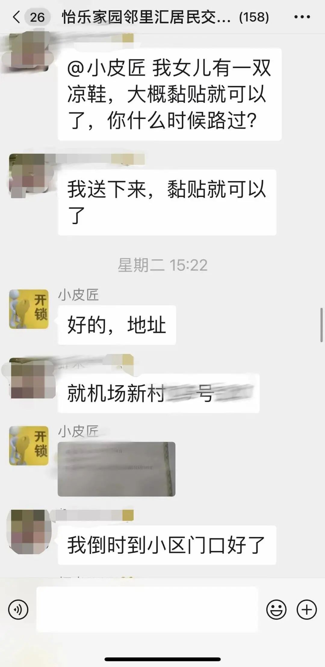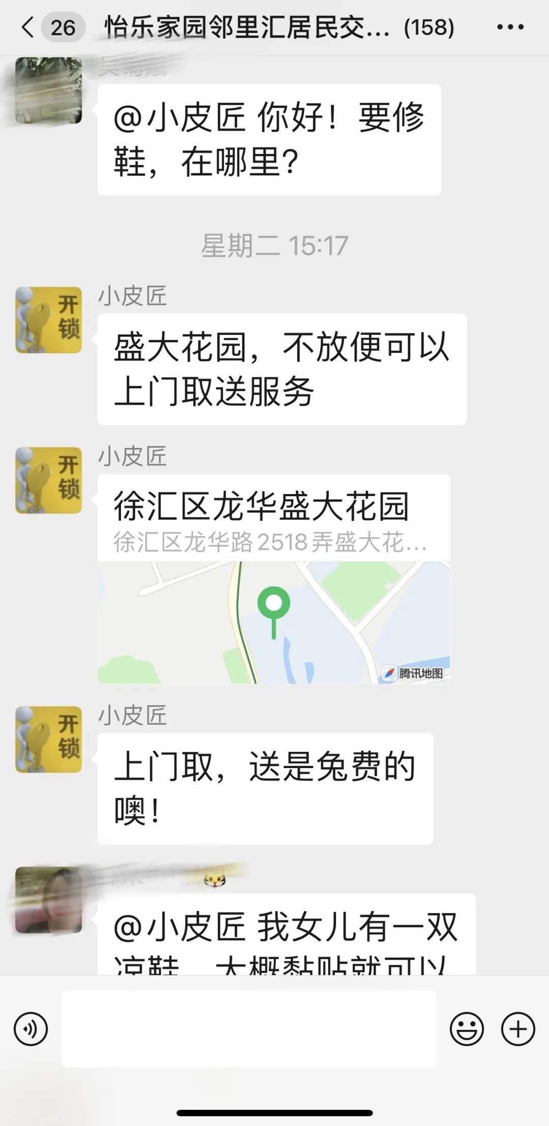 近日,居民群里大家讨论得热火朝天,有不少老人在群里提出需求:修鞋、修伞、配钥匙......