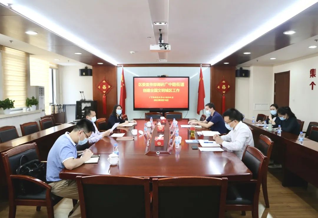 9月16日下午,区委常委、宣传部部长吴强,区委宣传部副部长、区文明办主任宋叶赴广中路街道调研指导全国文明城区创建工作。街道党工委书记杨静,党工委副书记、办事处主任潘璐,党工委副书记徐雪琛参加调研。